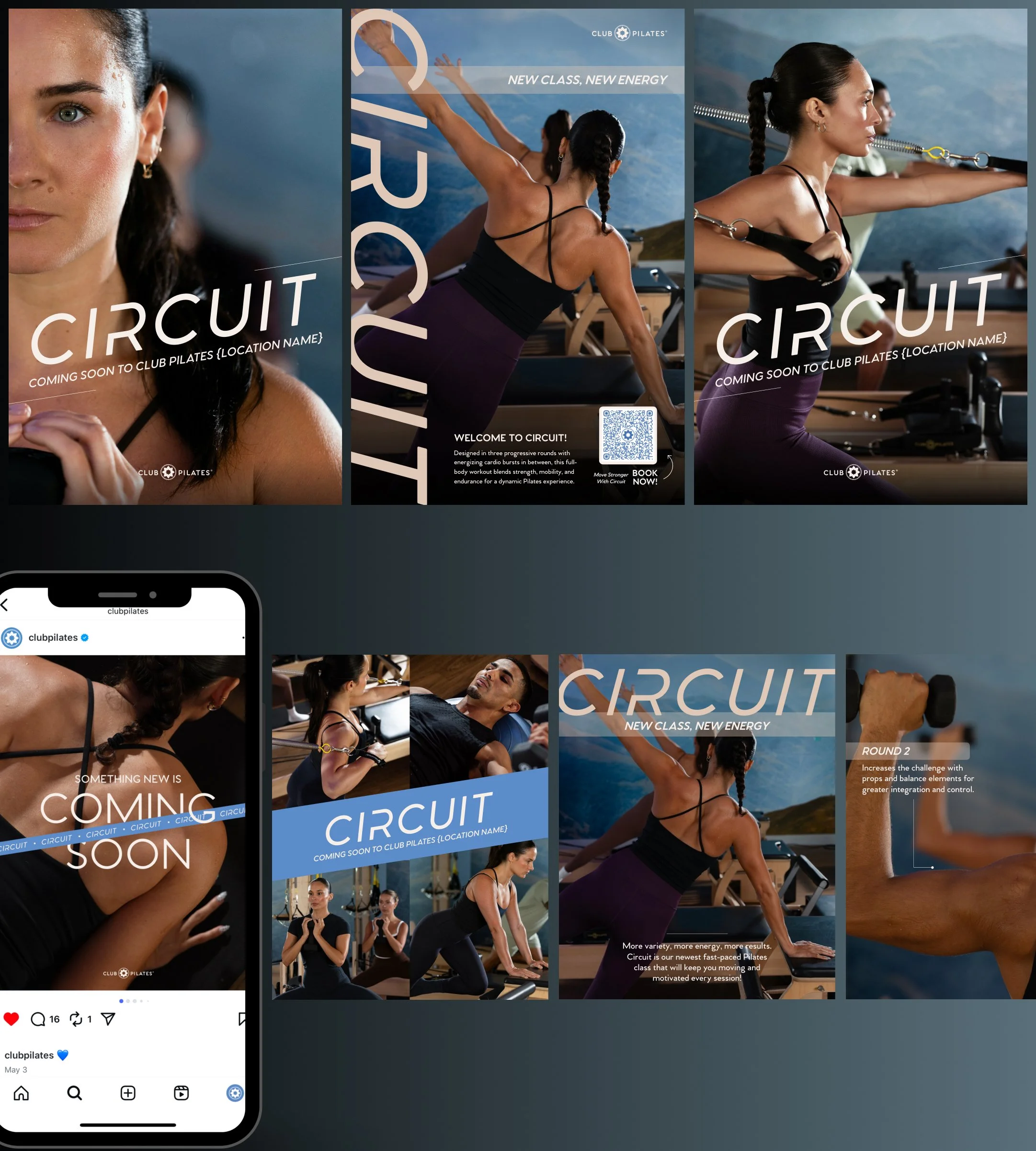 Club Pilates’ first-ever Circuit class marked the brand’s most significant class launch in years—designed to broaden its audience and attract members seeking a more advanced, elevated workout. I supported the creative direction by helping establish the visual tone through moodboards and concept development, ensuring the campaign aligned with this next chapter of the brand. I helped shape the photography style ahead of the shoot by collaborating on shot lists, styling, and editing direction. I then designed both teaser assets and official launch materials, including print collateral, social graphics, and segmented email campaigns. The result was a bold, minimal, and empowering visual campaign that positioned Circuit as a dynamic new offering for both current members and new prospects.